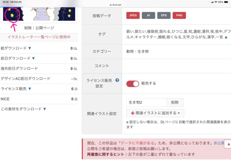 あっホントだ!ってなりました。描き上げたら即投稿することが多いので気づけませんでした。審査終わるまで9日掛かっているので、もっと気をつけよう。ここからさらに9日掛かるし遠い目。